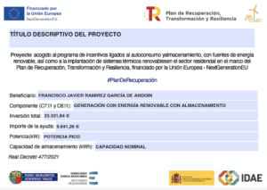 “Este proyecto está acogido al programa de incentivos ligados al autoconsumo y almacenamiento, con fuentes de energía renovable, así como a la implantación de sistemas térmicos renovables en el sector residencial en el marco del Plan de Recuperación, Transformación y Resiliencia, financiado por la Unión Europea – NextGenerationEU.”